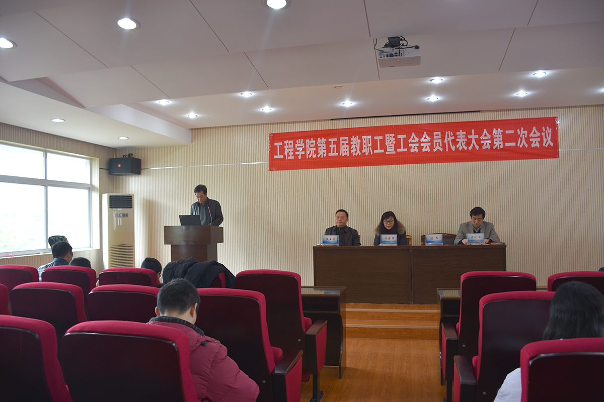 院工会主席蔡记华作题为“发挥工会职能作用,服务学院和谐发展”的报告及财务报告。副院长倪晓阳作了学院财务收支工作报告。院工会副主席张伟丽作《工程学院五届一次教代会提案执行情况》工作报告。副院长窦斌作关于完善实验室收费管理补充文件的阐述与说明。