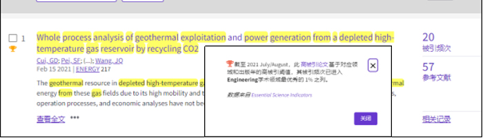 (通讯员:黄静)根据2021年11月基本科学指标数据库(Essential Science Indicators,简称ESI)最新数据显示,工程学院勘察与基础工程系崔国栋副教授于2021年在国际工程技术顶级期刊Energy上发表的学术论文“Whole process analysis of geothermal exploitation and power generation from a depleted high-temperature gas reservoir by recycling CO2”入选ESI高被引论文(Highly Cited Paper)。该论文第一作者兼通讯作者为崔国栋副教授,中国地质大学(武汉)工程学院为第一署名单位。