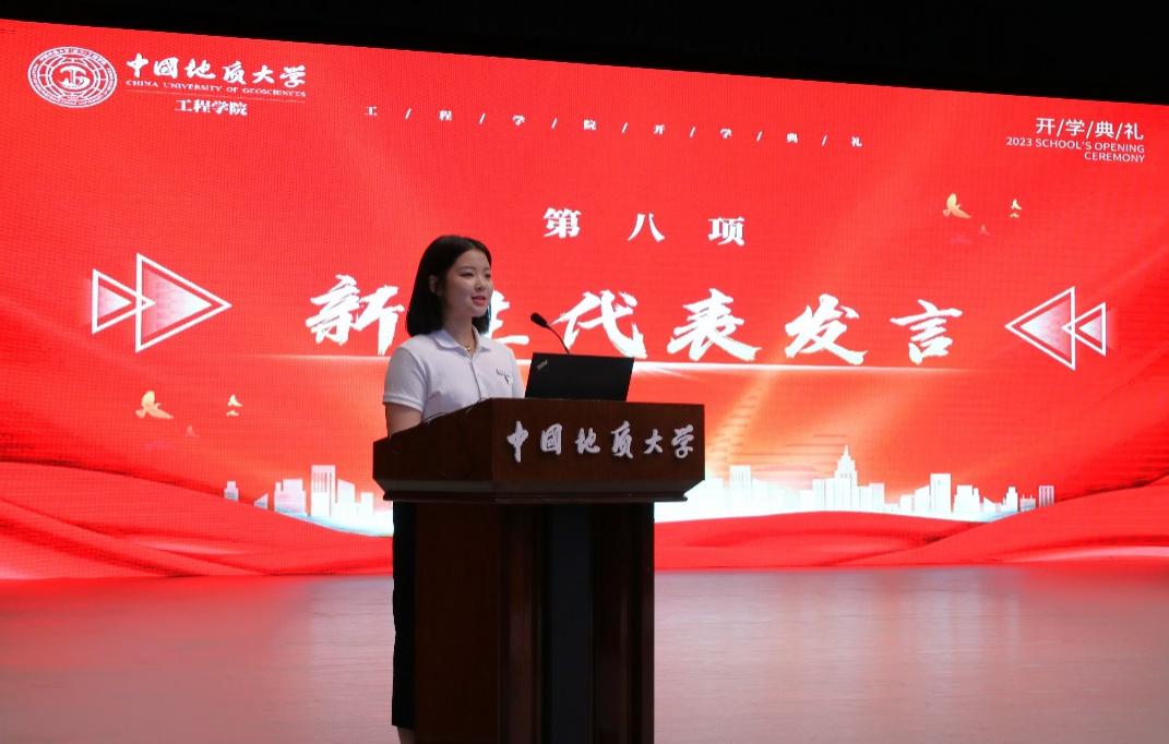 2023级05D231班张高涵同学作为本科生新生代表发言。他说,在长辈厚重岩土气息的熏陶下,自己终于如愿考进地质大学,加入工程学院。他对开学报到以来学院领导老师给予的教育关怀表示感谢,对军事训练当中空军预警学院教官对自己坚忍毅力和良好作息的打造由衷感激,他立志与其他505名本科新生同学一道,以强国建设、民族复兴的时代号召为号角,以“品德高尚、基础厚实、专业精深、知行合一”的成才目标为向导,直挂云帆,乘风破浪,早日成为德智体美劳全面发展的中国特色社会主义事业的建设者和接班人。