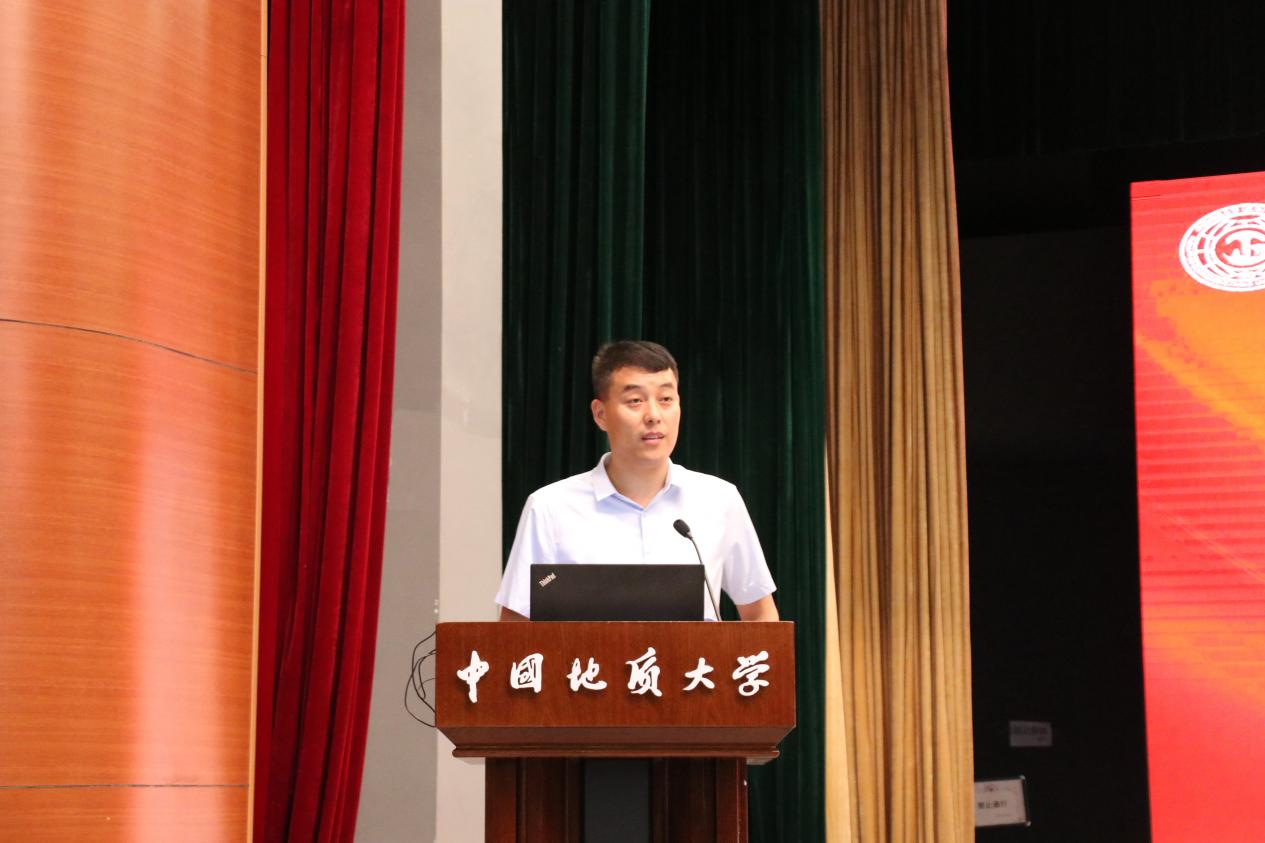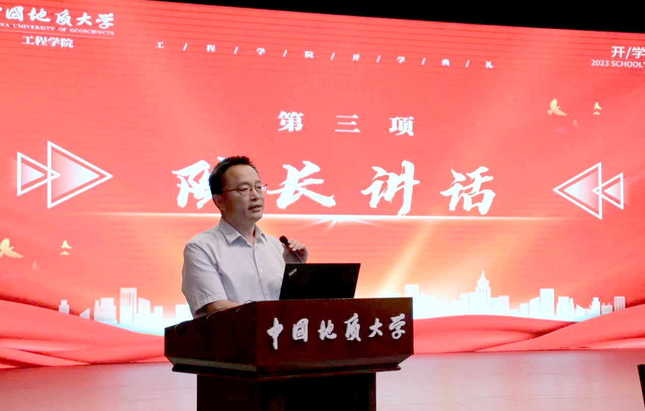 工程学院院长焦玉勇教授讲话。他以“祝贺”“欢迎”“希望”寄语新生,祝贺860位新生加入国家工程行业,欢迎同学们来到中国地质大学工程学院,为学院发展注入新鲜血液、增添奋进力量。他系统全面的向大家介绍了学院的历史沿革、系室设置、师资力量、学科建设、科学研究、国际交流等基本情况,勉励全体新生用习近平新时代中国特色社会主义思想凝心铸魂,用“艰苦朴素,求真务实”的校训精神和“明理尚实、拓新砺行”的院训精神领航前进,跟随学校学院的发展步伐,用好学校学院的发展平台,毅然投身于国家工程建设行业当中,迎难而上、奋勇前行,不负历史、不复时代,为把学院建设成为地质工程与人居安全领域特色鲜明、享誉国际的一流研究型学院不懈努力!